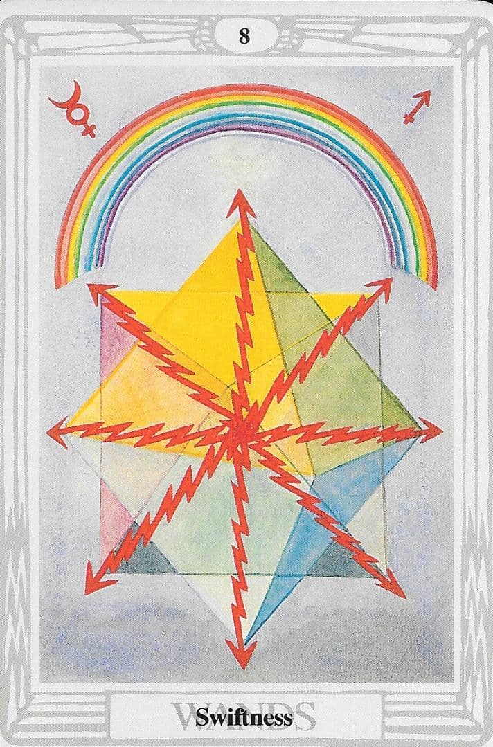 "The position is doubly unbalanced; off the middle pillar, and very low down on the Tree. It is taking a very great risk to descend so far into illusion, and, above all, to do it by frantic struggle. Netzach pertains to Venus; Netzach pertains to Earth; and the greatest catastrophe that can befall Venus is to lose her Heavenly origin. The four Sevens are not capable of bringing any comfort; each one represents the degeneration of the element. Its utmost weakness is exposed in every case."